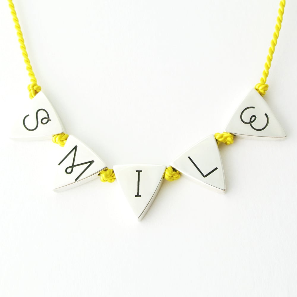 Each flag features a monoline sans-serif letter or symbol, with a romantic old-meets-new aesthetic. Each flag is made of highly polished solid sterling silver, and has a clean modern look. Your bunting will arrive on silk cord, spaced with knots if you order more than one. Tie it in a knot and wear it long, or keep it short and fasten with a simple bow on the back of your neck.
